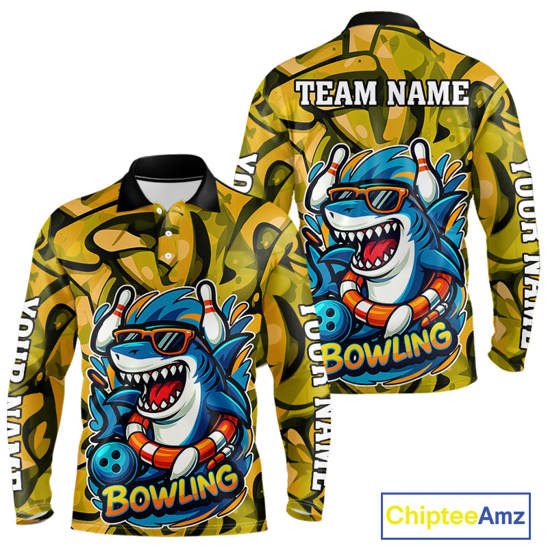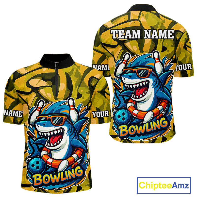 Funny Yellow Camo Shark Men Bowling Polo, Quarter Zip Shirts Custom Team Shark Bowling Outfit Jersey NQS10077