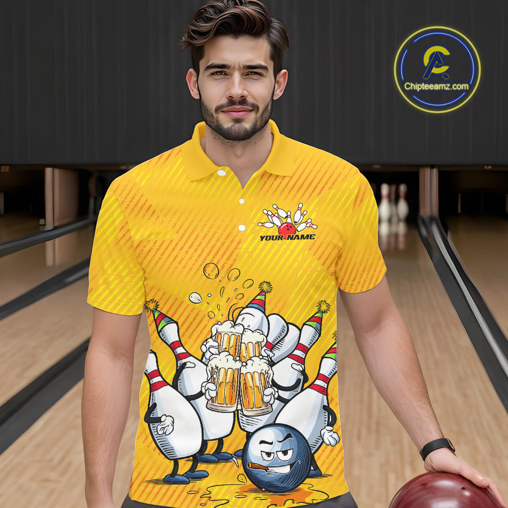 Custom Funny Bowling And Beer Men Polo Shirts, Bowling Ball And Pins Party Jerseys IPHW9827