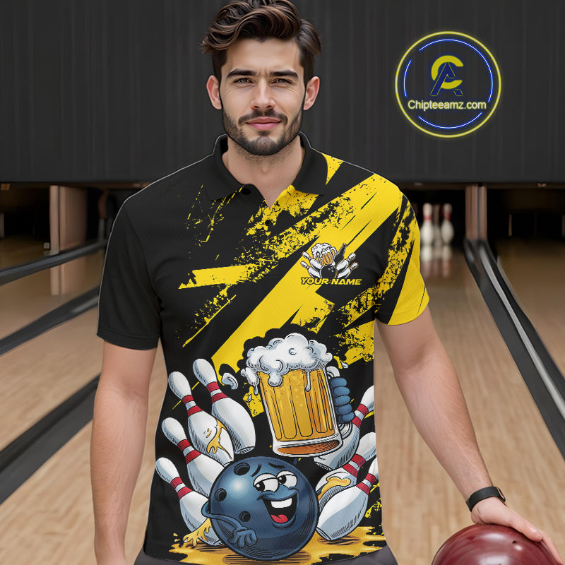 Custom Grunge Yellow Funny Bowling And Beer Polo Shirts For Men, Bowling Team Outfit IPHW9831