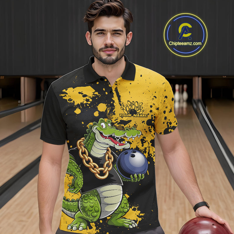 Custom Yellow Splatter Funny Alligator Bowling Men Polo Shirts, Bowling Team Shirts IPHW9920