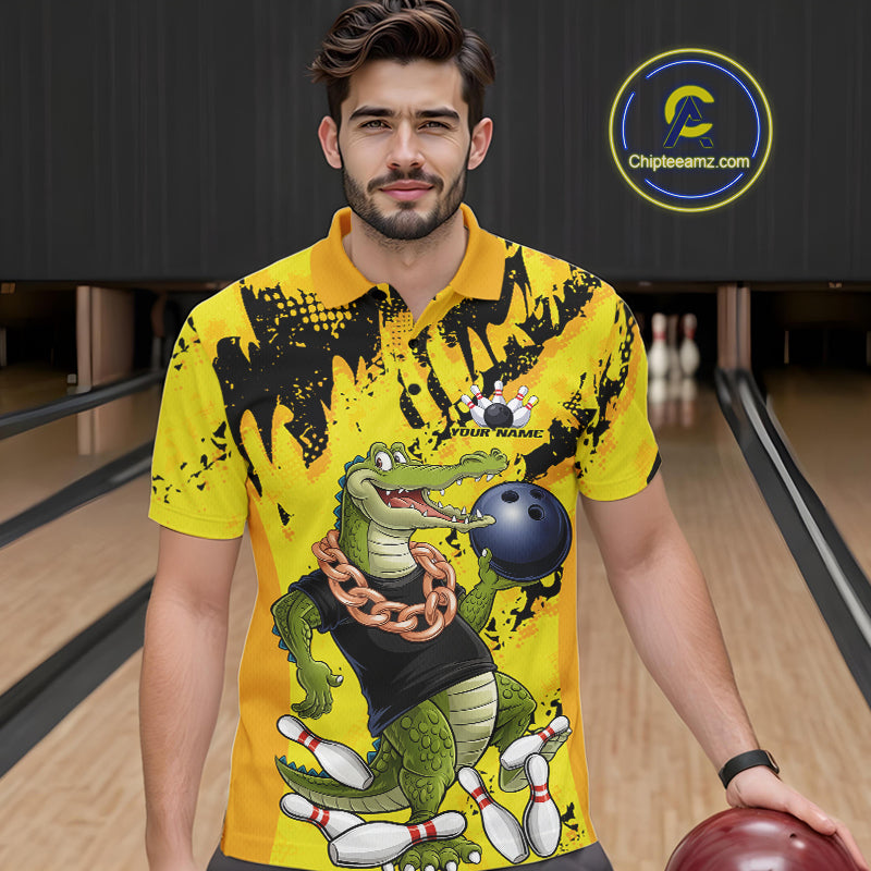 Custom Funny Alligator Bowling Polo Shirt For Men, Grunge Yelllow Bowling Team Jerseys IPHW9922