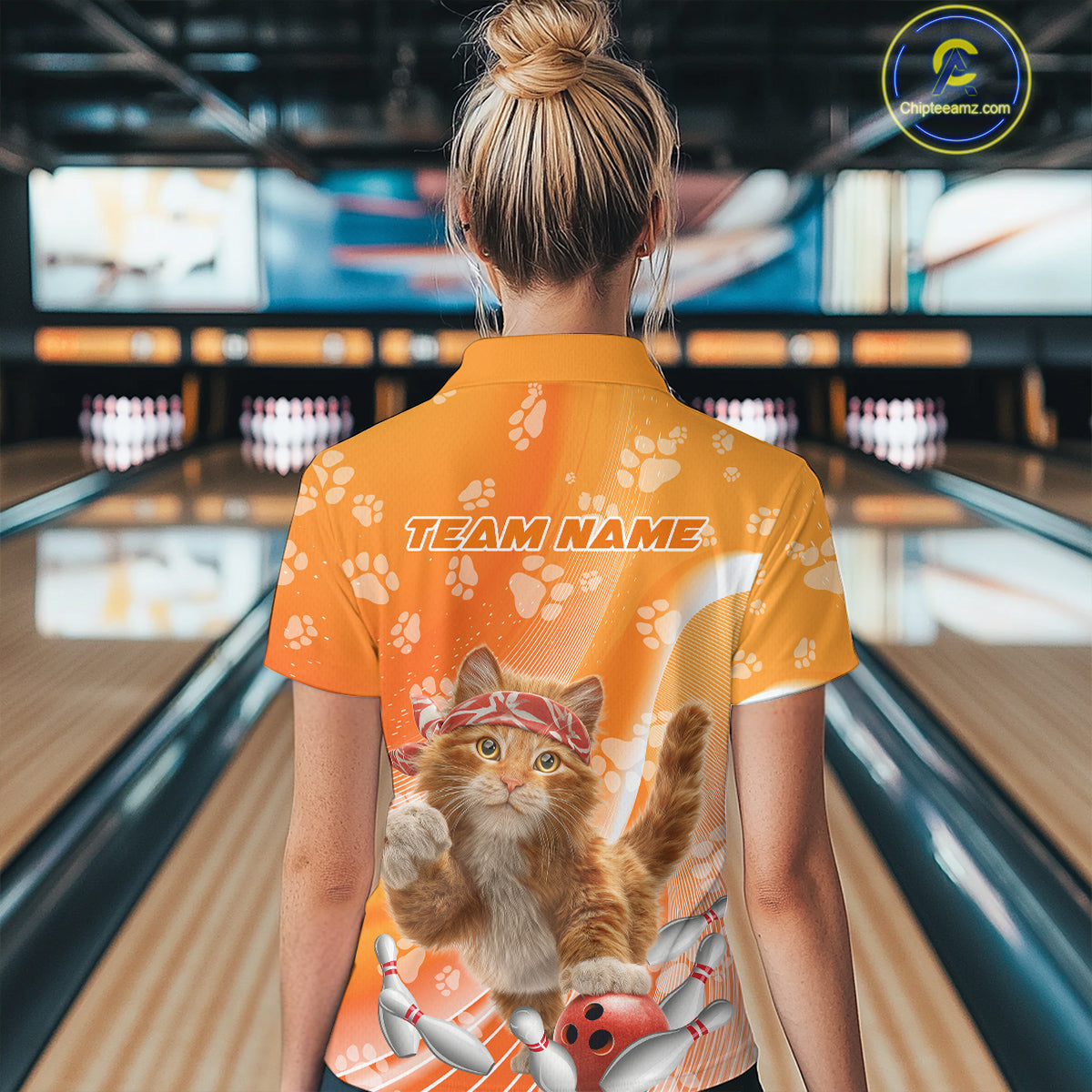 Custom Funny Orange Cat Bowling Women Polo Shirt, Cat Paw Team Bowling Shirt IPHW10103