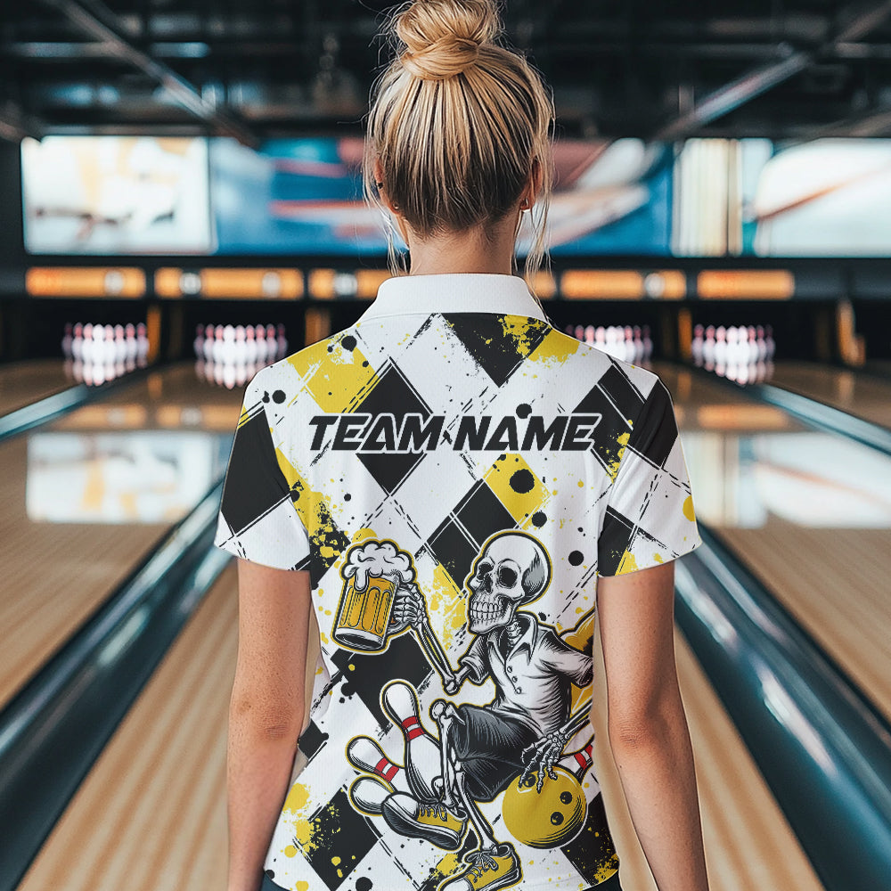 Custom Yellow Argyle Pattern Funny Skeleton Bowling And Beer Women Polo Shirts, Team Outfit IPHW8892