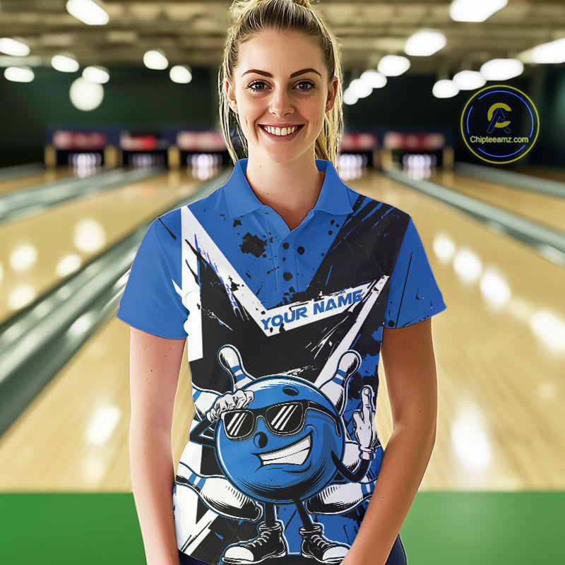 Custom Black And Blue Star Funny Bowling Polo Shirts For Women, Bowling Tournament Shirt IPHW9359