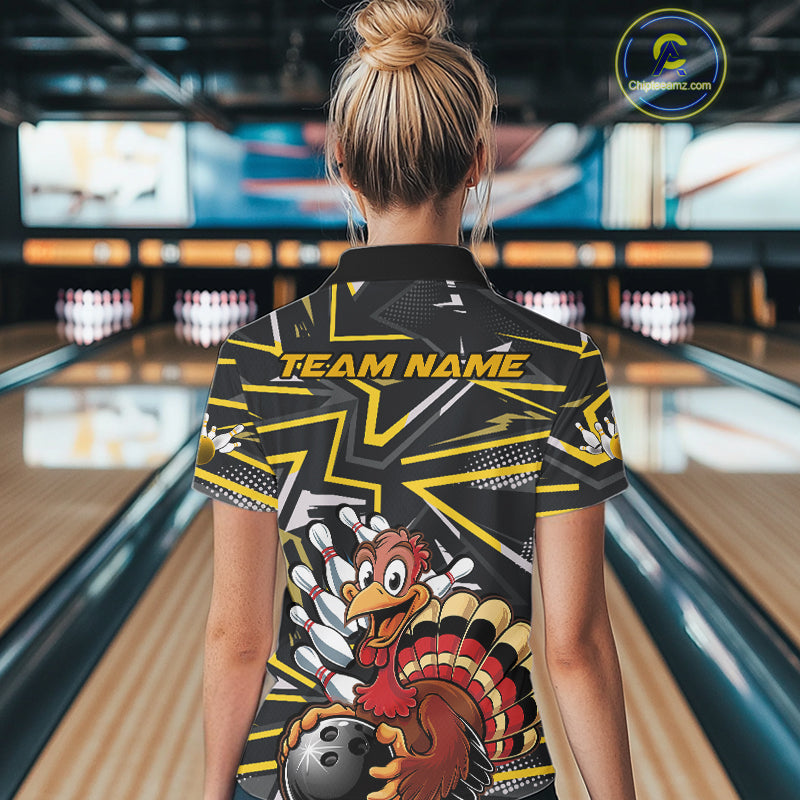 Custom Funny Turkey Bowling Jerseys, Yellow Thanksgiving Bowling Team Women Polo Shirt IPHW9722