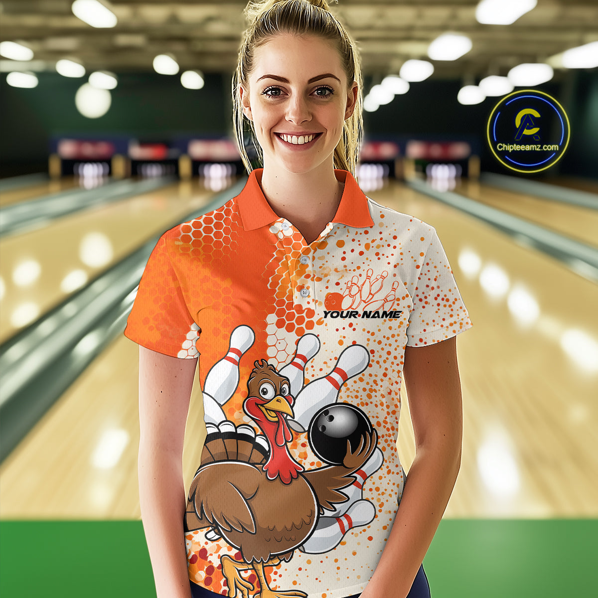 Custom Funny Orange Thanksgiving Turkey Bowling Team Women Polo Shirts, Bowling Jerseys IPHW9767
