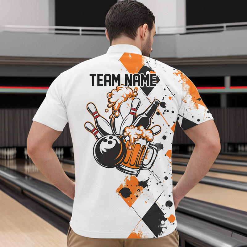 Orange Argyle Pattern Custom Funny Bowling And Beer Team Quarter-Zip Shirts For Men IPHW8890