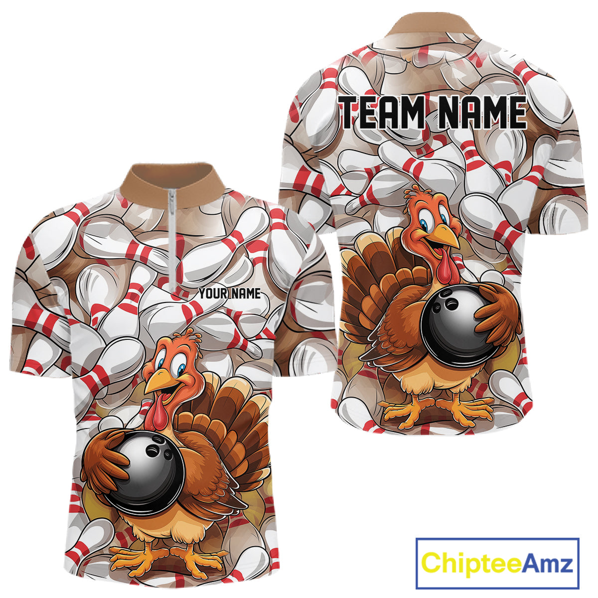 Custom Funny Thanksgiving Turkey Bowling Quarter-Zip Shirts For Men, Thanksgiving Bowlers Outfit IPHW9719