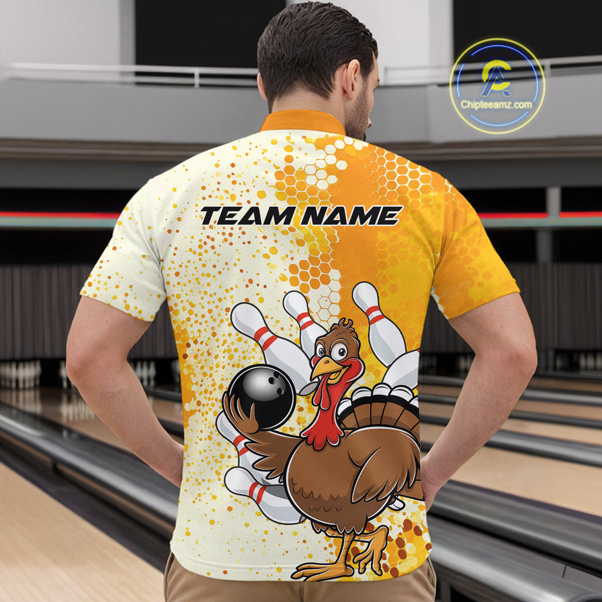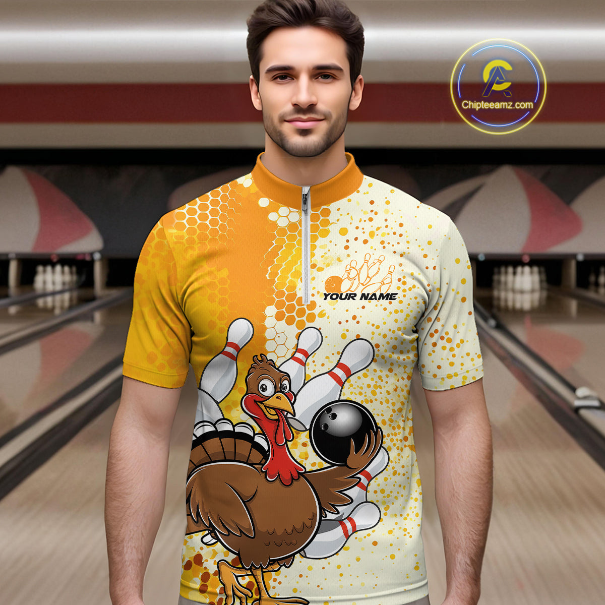 Custom Funny Yellow Thanksgiving Turkey Bowling Team Men Quarter-Zip Shirts, Bowling Jerseys IPHW9768