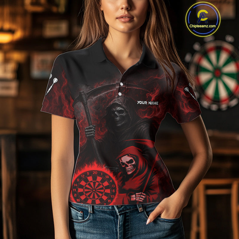 Custom Red Smokes Flame Dartboard Grim Reaper Dart Women Polo Jerseys Dart Team Shirt NYN1656