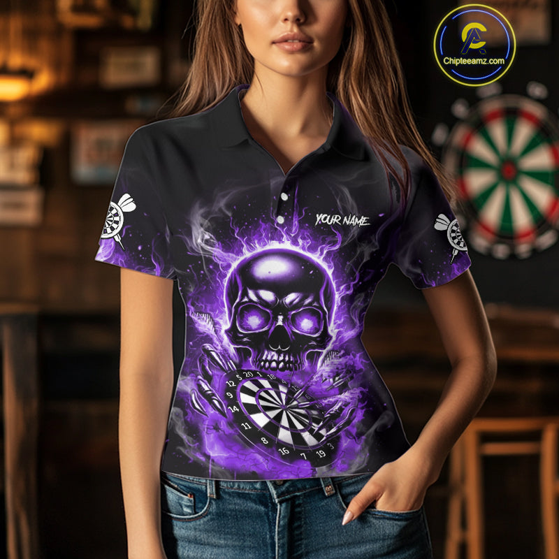 Custom Fire Flame Dartboard Lightning Purple Skull Dart Women Polo Jerseys Dart Team Shirt NYN1675