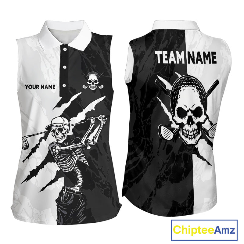 Funny Skull Golf Sleeveless Polo Shirt Custom Black And White Camo Pattern Golf Attire For Women NHN0047