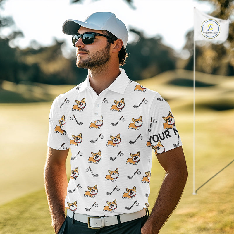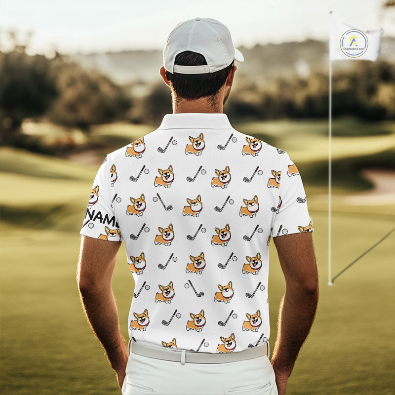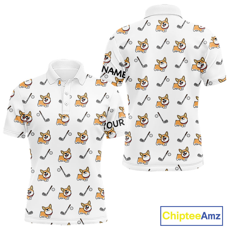 Mens Golf Polo Shirt Custom Cute Dogs Corgi Print White Golf Shirts For Men, Dog Lover Gift NHN0069