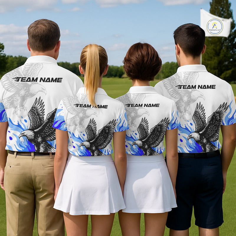 Mens Golf Polo Shirt Custom Eagle Blue Flame Golf Tops, Personalized White Golf Outfit For Men NHN0070