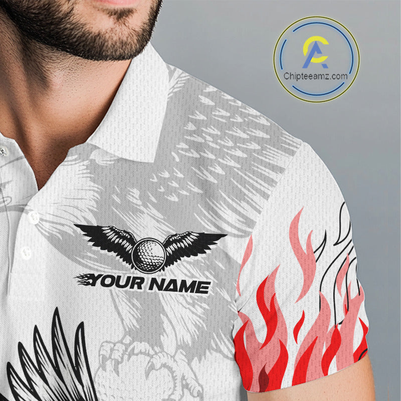 Mens Golf Polo Shirt Custom Eagle Red Flame Team Golf Tops, White Golf Outfit For Men NHN0070