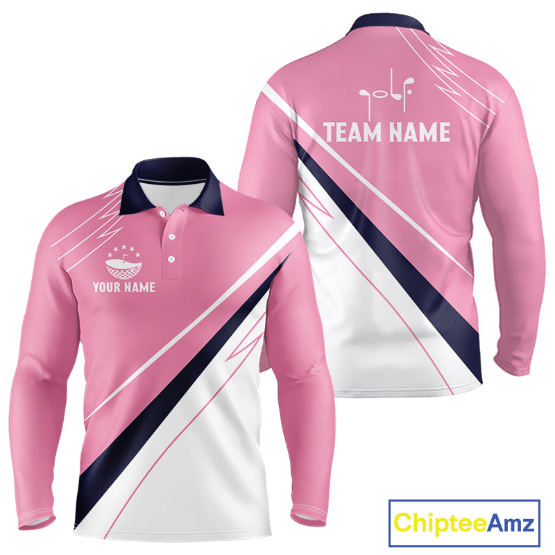 Mens Long Sleeve Golf Polo Shirt Custom Blue And Pink Golf Shirt Personalized White Team Golf Shirts NHN0075
