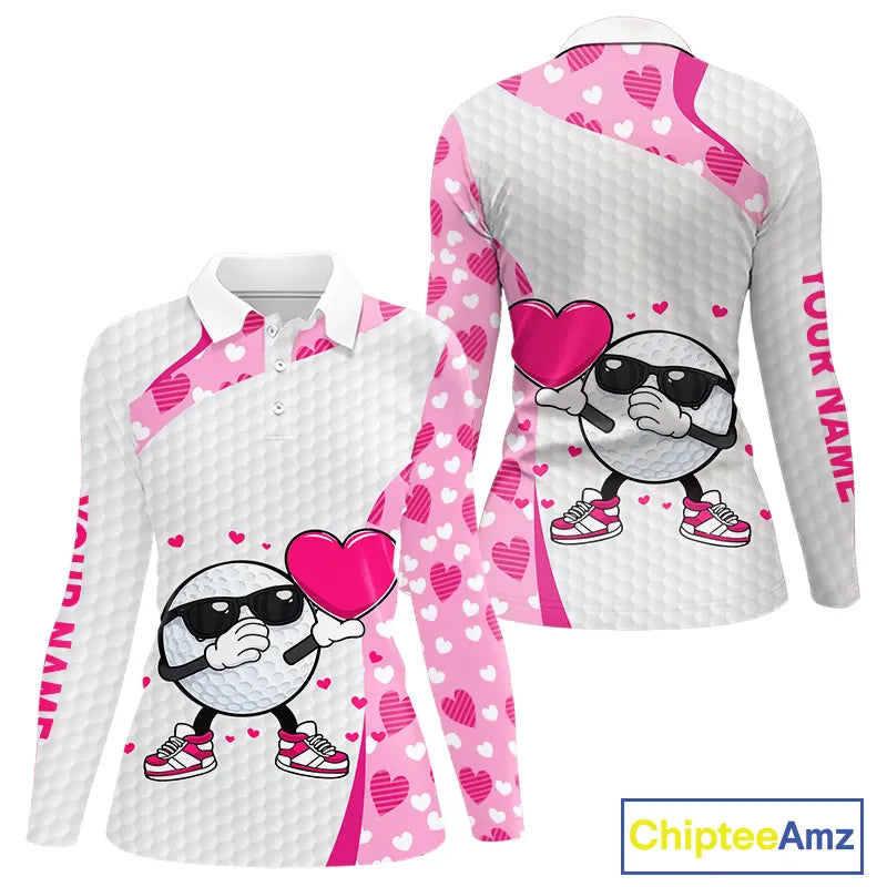 Personalized funny golf ball pink heart pattern white Womens golf polo shirts, Valentine golf gifts NQS11324