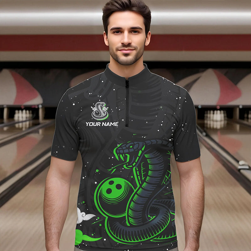 Black and Green Cobra Snake Bowling Polo, Quarter Zip Shirts For Men Custom Name Bowling Team Shirts NQS9655