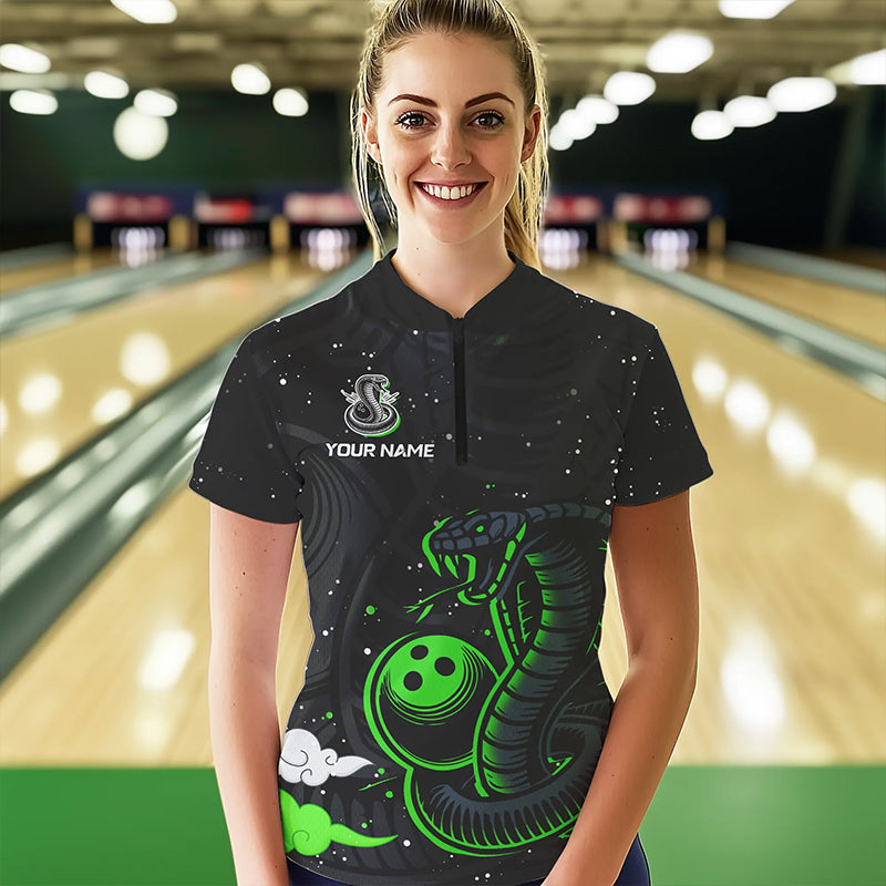 Black and Green Cobra Snake Bowling Polo, Quarter Zip Shirts For Women Custom Name Bowling Team Shirts NQS9655