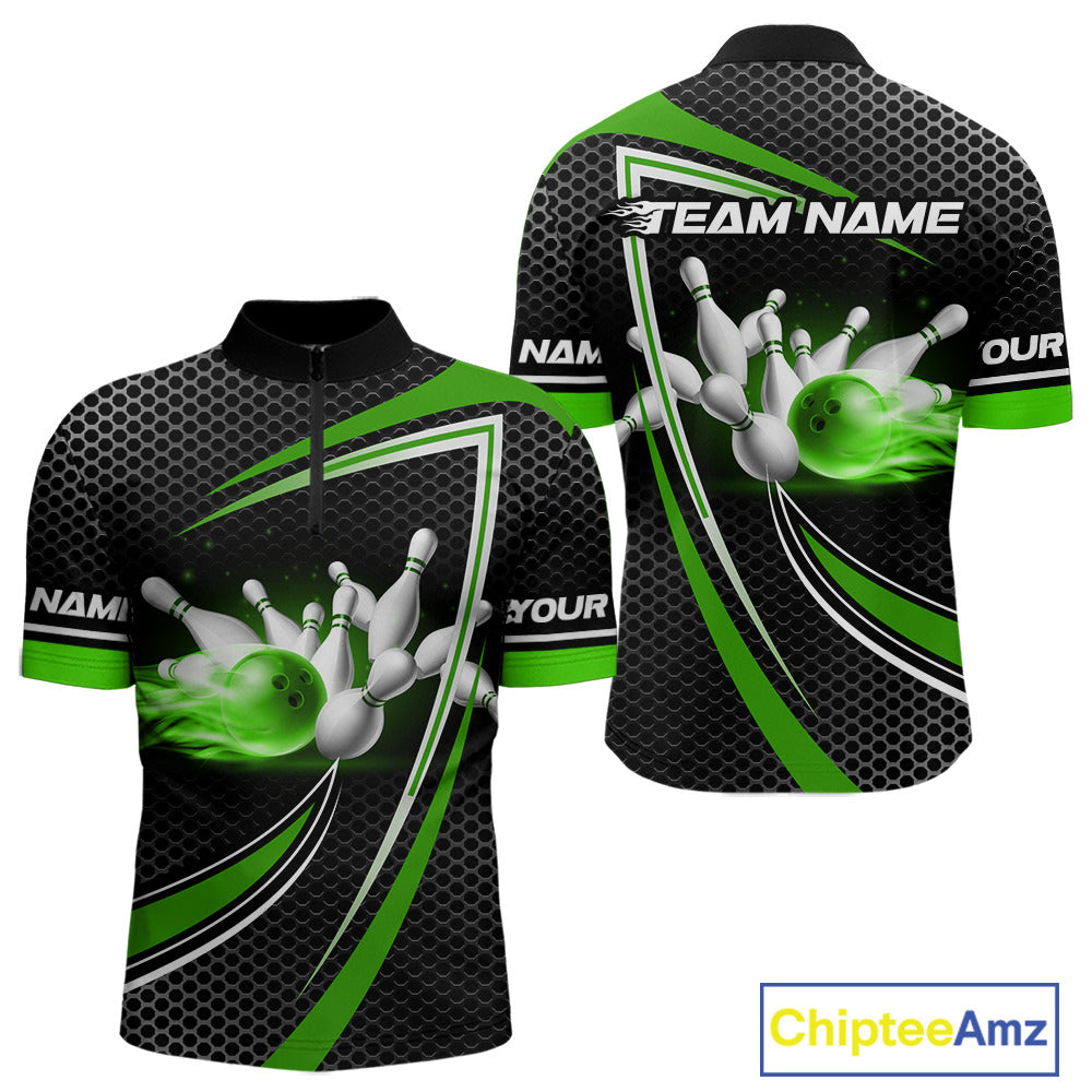 Black and Green Flame Bowling Shirts For Men Custom Team Bowling Jersey, Gift For Bowlers NQS10858