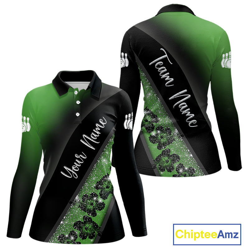 Black and Green Glitter Flower Bowling Polo, Quarter Zip Shirt for Women Custom Bowling Team Jerseys NQS10384