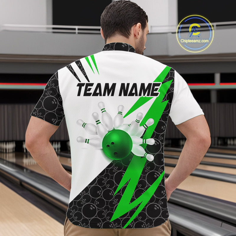 Black and White Bowling Polo, Quarter Zip Shirt for Men Custom Lightning Team bowling jerseys | Green NQS9838