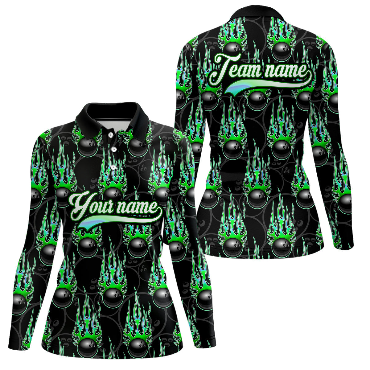 Black Bowling Ball Camo Green Flame Bowling Polo, 1/4 Zip Shirt for Women Custom Bowling Team Jersey NQS9479