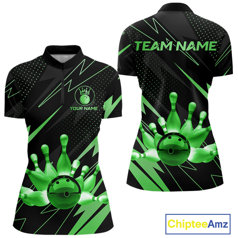 Custom Black and Green Bowling Polo, Quarter Zip Shirts for Women, Team Bowling League Jersey NQS10893