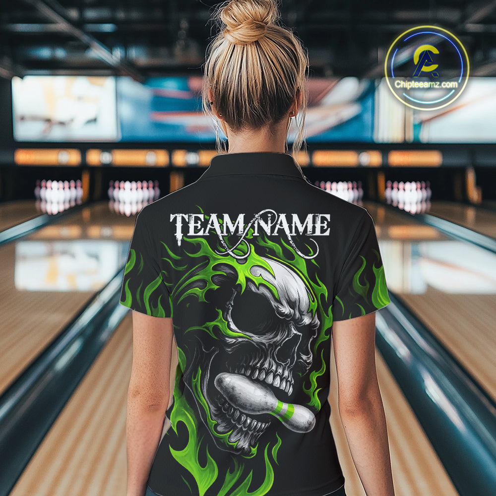 Custom Black and Green Flame Skull Bowling Shirts For Women, Personalized Skull Team Bowling Jersey NQS10793