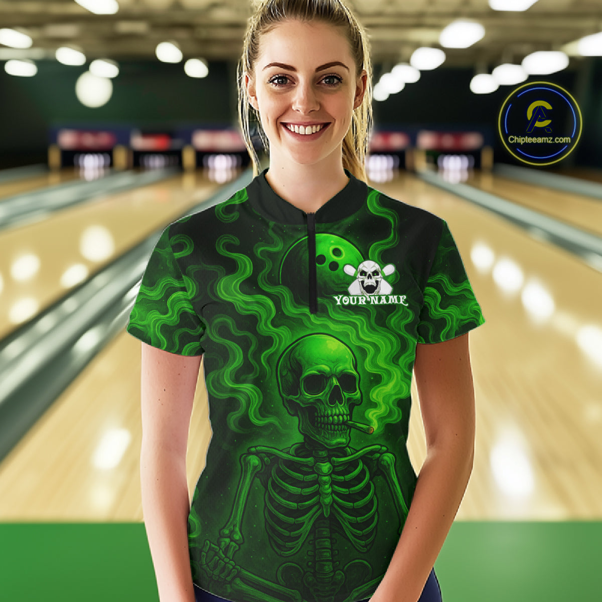 Custom Green Smoke Skull Bowling Polo, Quarter Zip Shirts For Women, Skull Team Bowling Jersey NQS10798