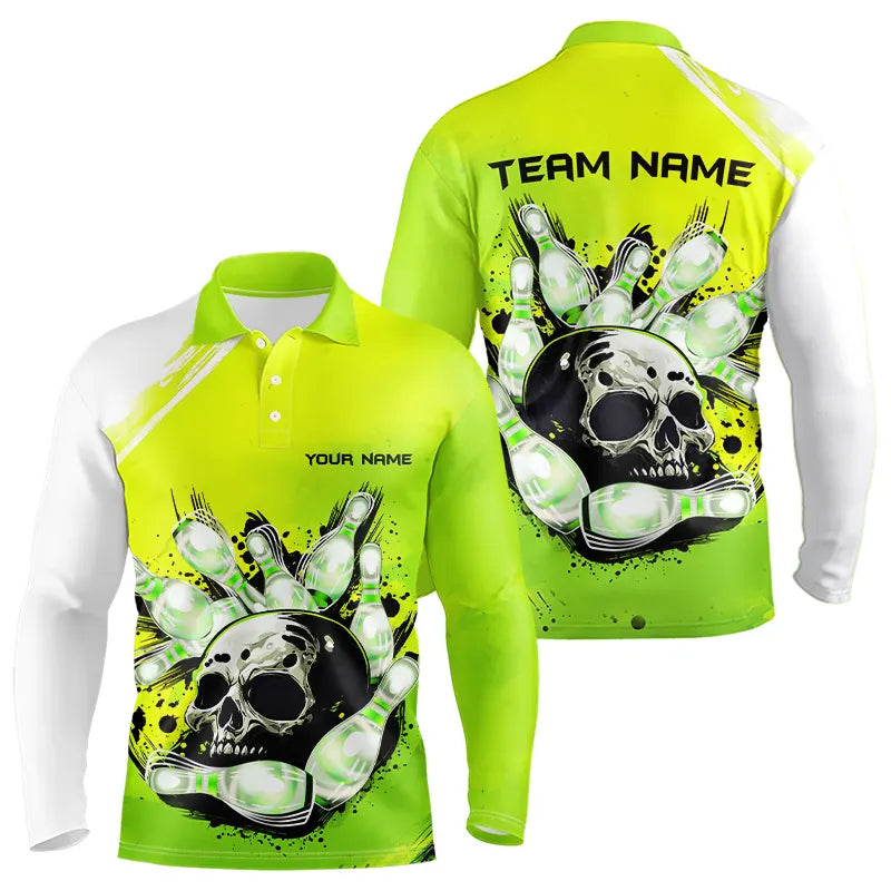 Green Skull Bowling Ball and Pins Bowling Polo, Quarter Zip Shirts for Men Custom Team Bowling Jerseys NQS9211