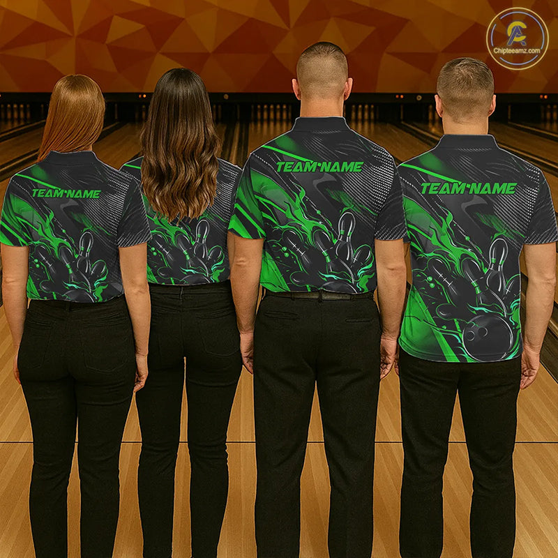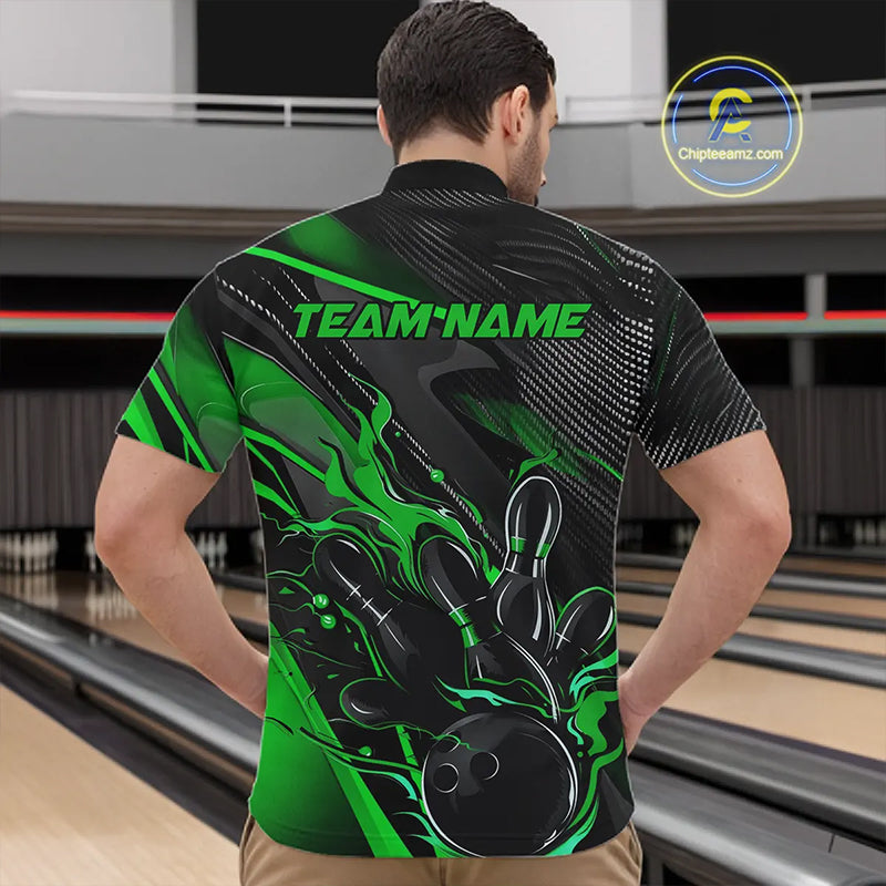 Black And Green Custom Flame Bowling Shirts For Men, Fire Bowling Team Shirt Bowler Jersey IPHW7934