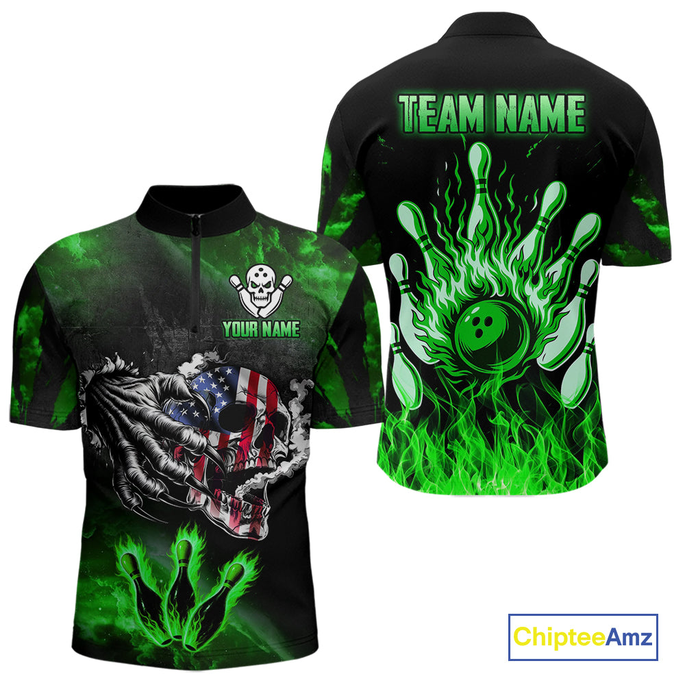 Green Flaming American Flag Skull Bowling Shirt For Men Custom Fire Bowling Team Jersey TDM4656