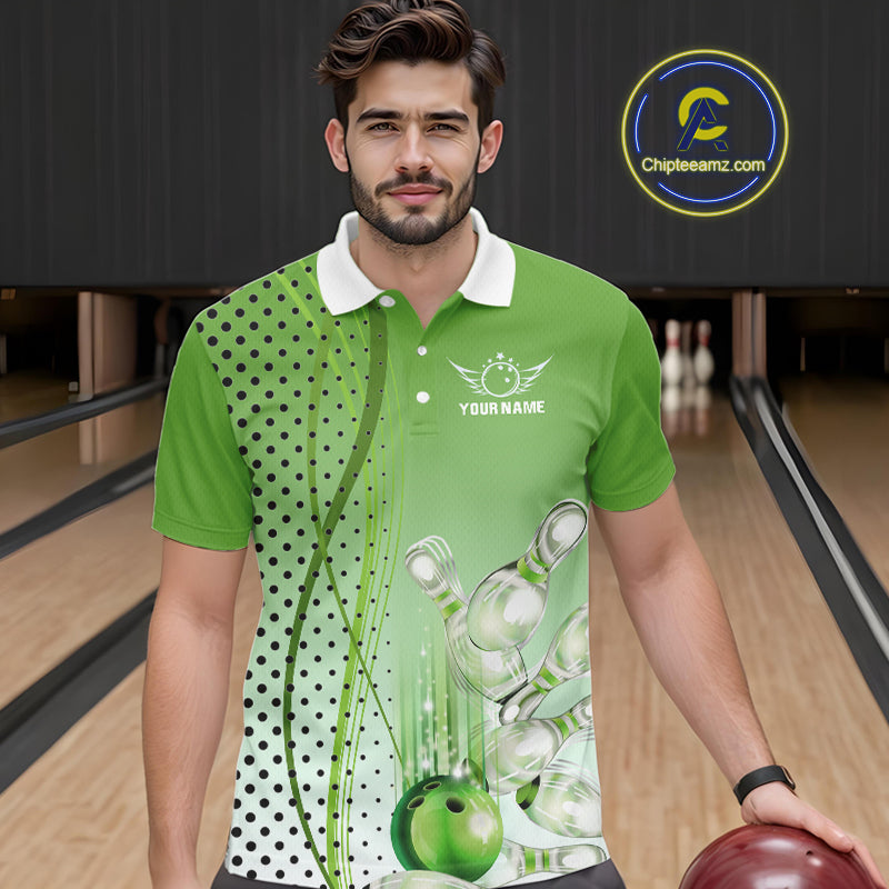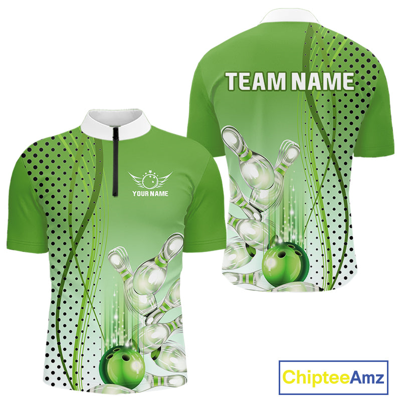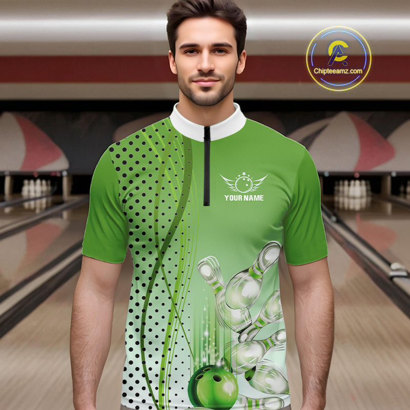 Mens bowling polo, quarter zip shirts Custom bowling team jerseys, gift for Bowlers | Green NQS10072