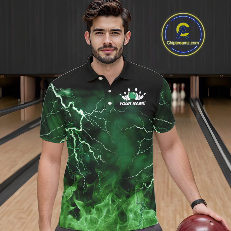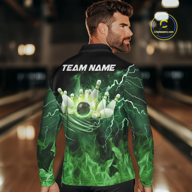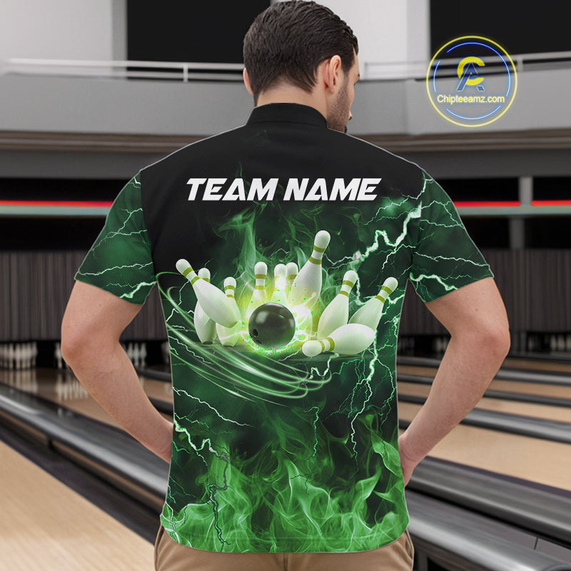 Mens bowling shirts Custom green lightning thunder flame Bowling Team Jersey, gift for team Bowlers NQS10388