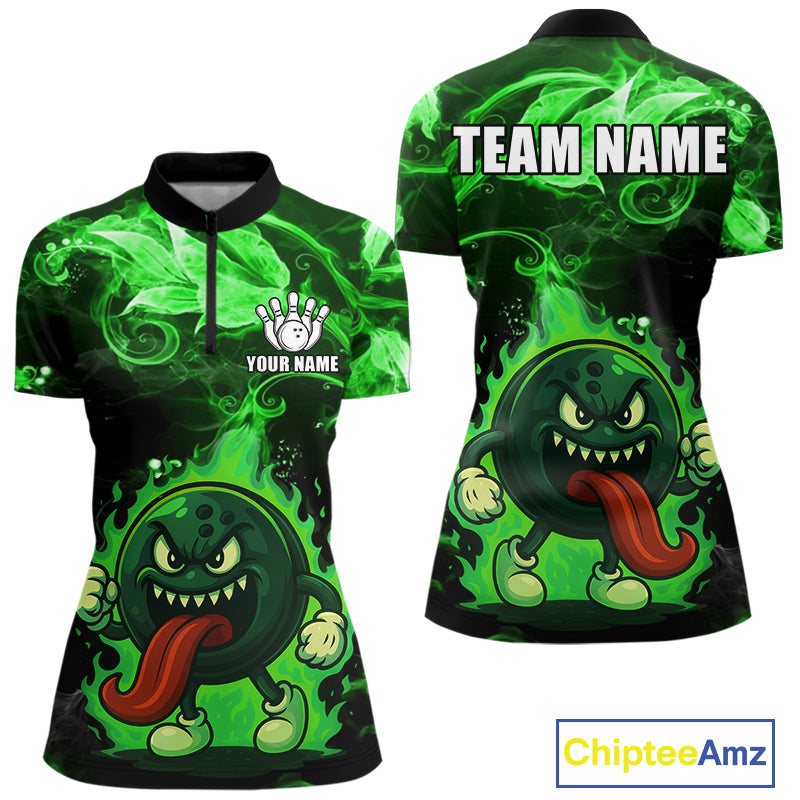 Personalized Funny Bowling Shirts for Women Green Flame Custom Bowling Team Outfit, Gift For Bowlers NQS10909