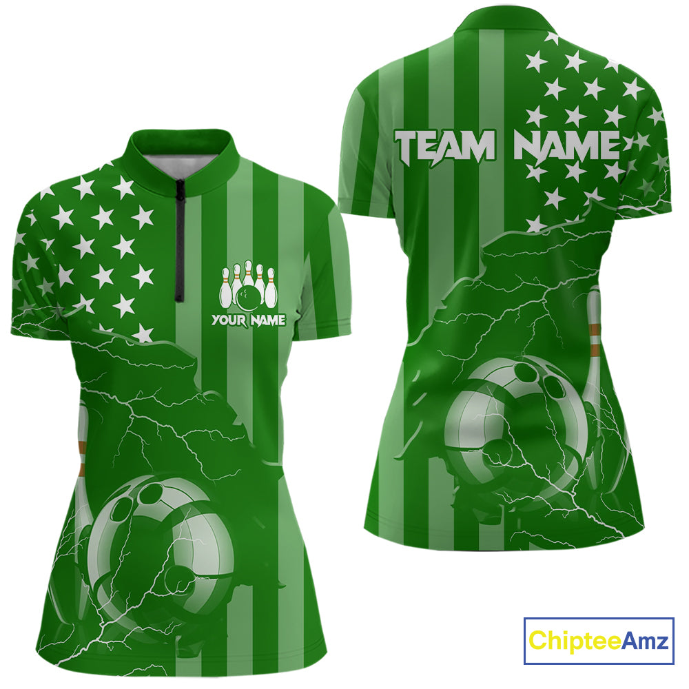 Personalized Green American flag Lightning thunder Custom Bowling Team Shirt For Women Bowling Jersey NQS10487
