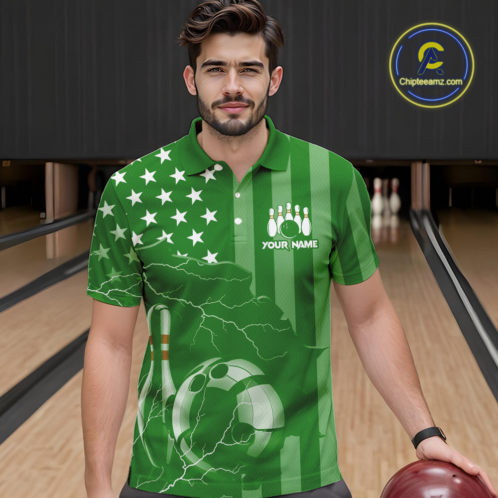 Personalized Green American flag Lightning thunder Custom Bowling Team Shirts For Mens Bowling Jersey NQS10487