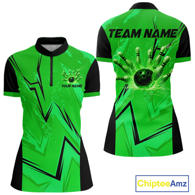 Personalized Green Lightning Thunder Bowling Polo, Quarter Zip Shirts For Women, Team Bowling Jersey NQS10832