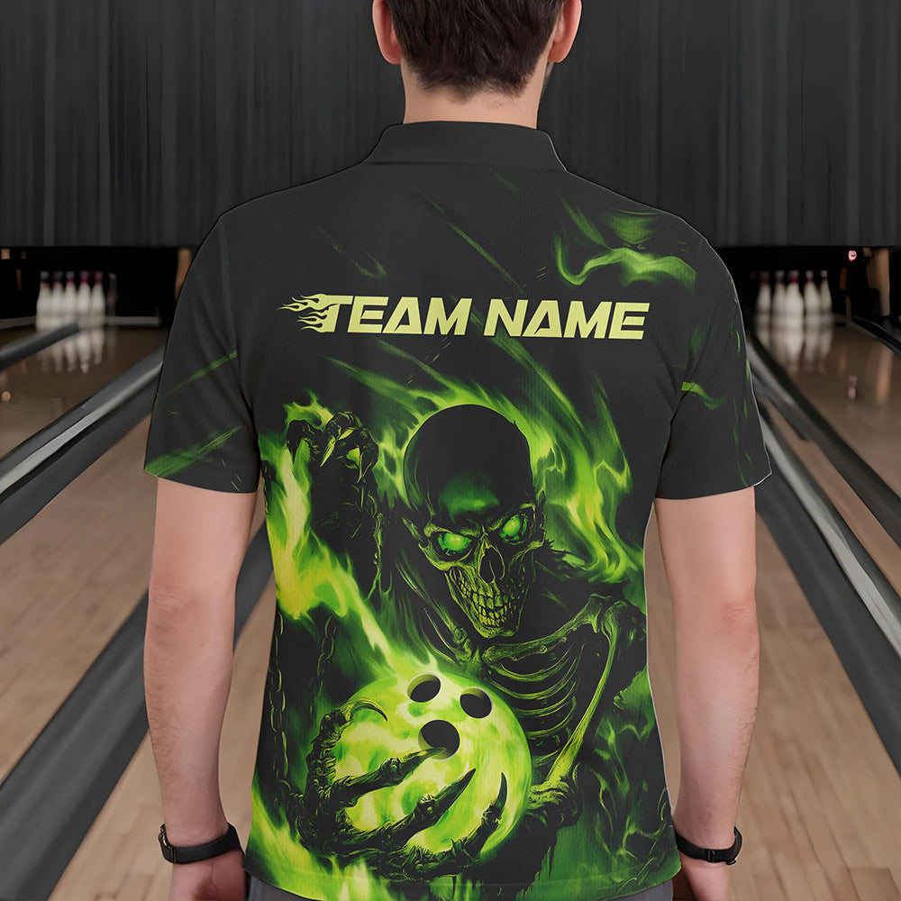 Black And Green Flame Skull Custom Bowling Polo Shirts For Men, Skeleton Bowling Team Shirt IPHW8400