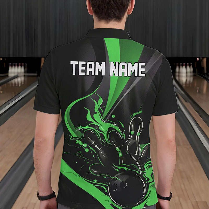 Custom Black And Green Flame Bowling Polo Shirts For Men, Fire Bowling Team Shirt IPHW8540