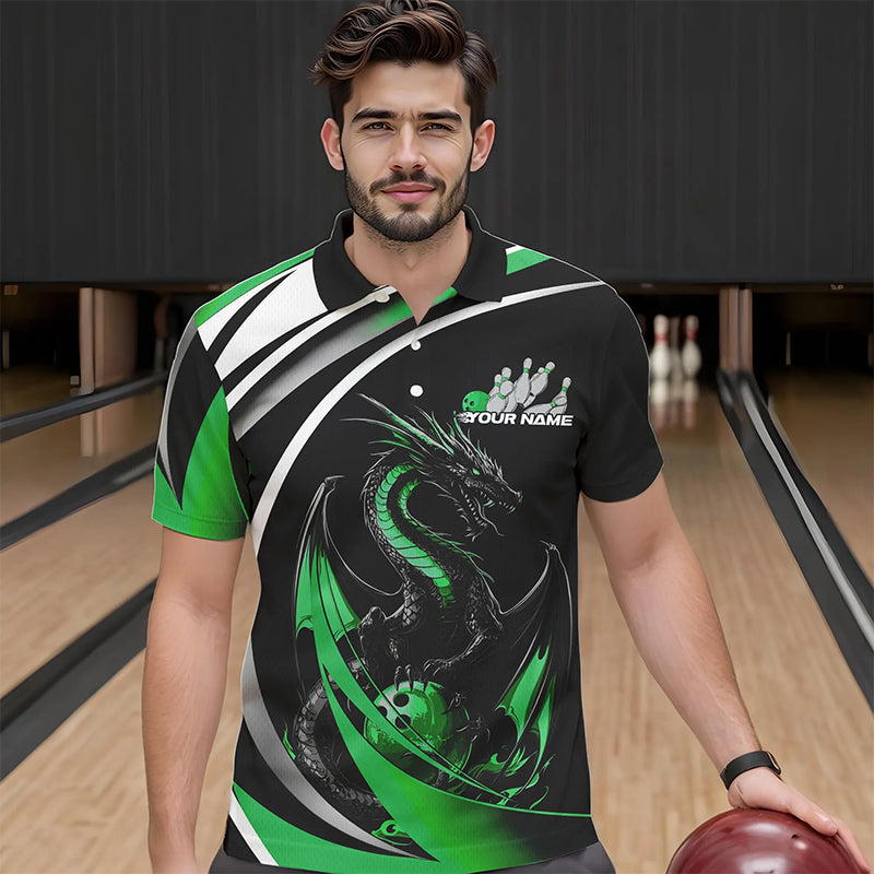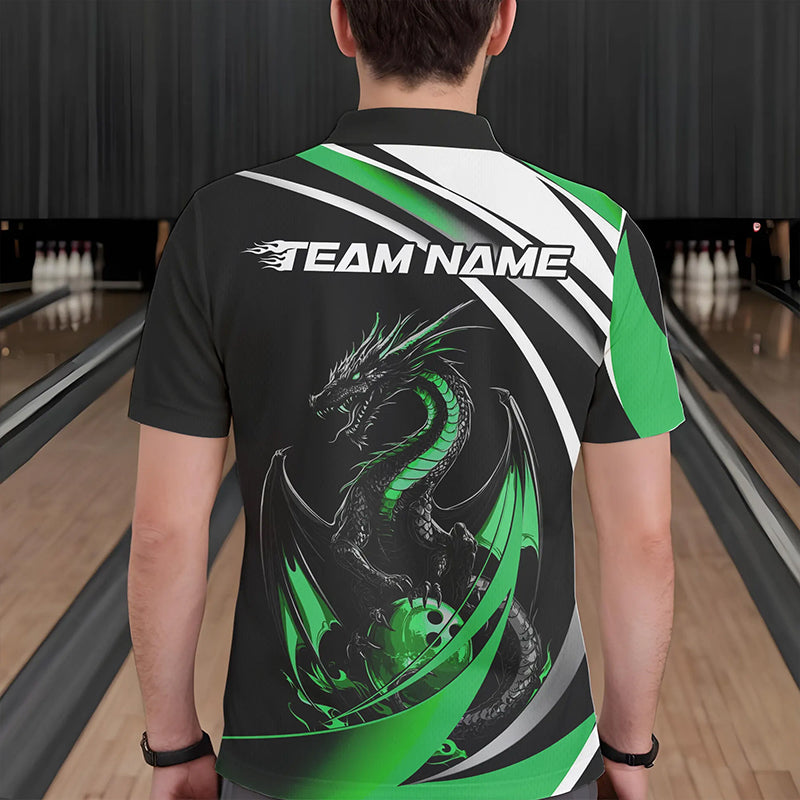 Custom Black And Green Dragon Bowling Jerseys, Dragon Bowling Team Polo Shirts For Men IPHW8652