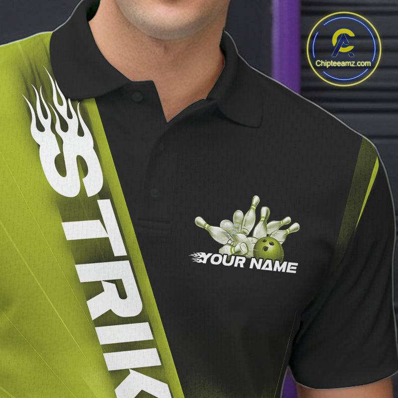 Custom Black And Green Strike Bowling Polo Shirts For Men, Bowling Team Uniform IPHW9553