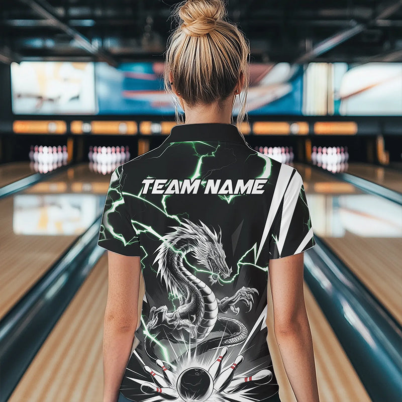 Custom Black And Green Thunder Lightning Dragon Bowling Team Polo Shirts For Women IPHW8555