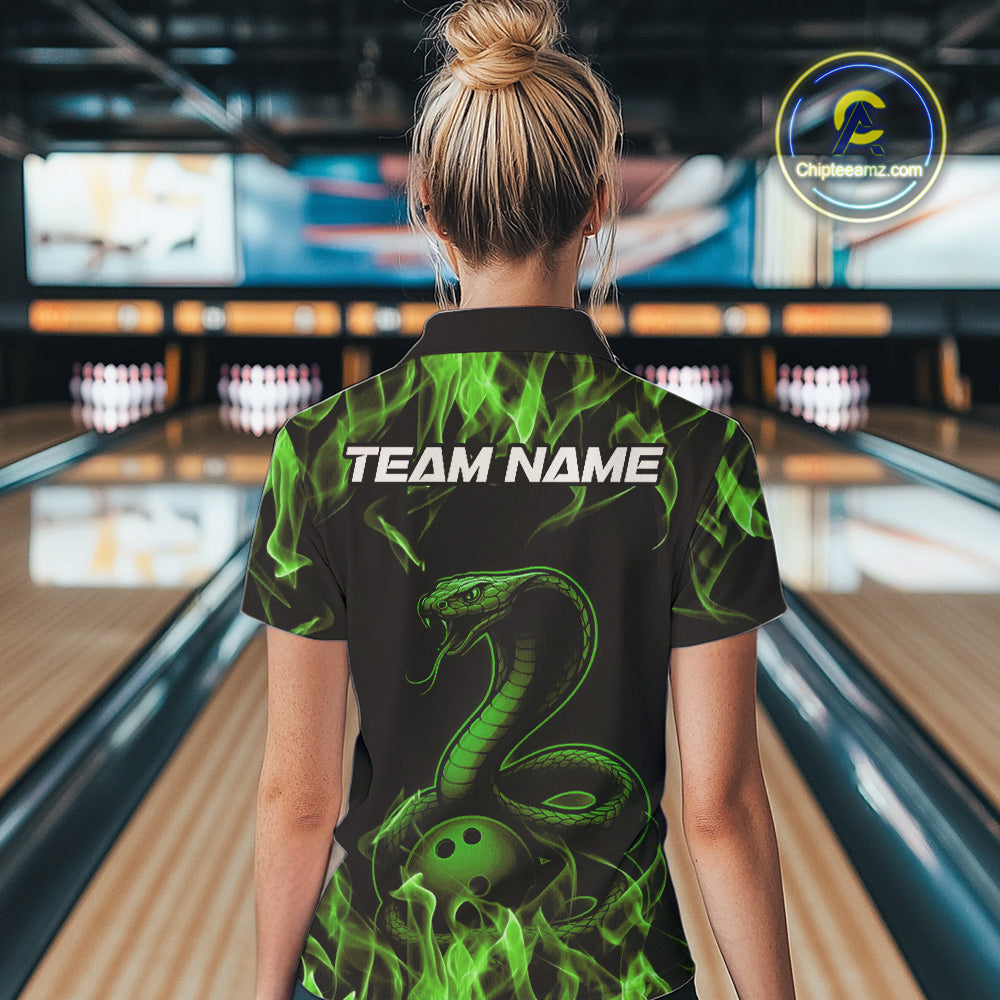 Custom Black And Green Flame Cobra Snake Bowling Women Polo Shirts, Bowling League Shirt IPHW9043