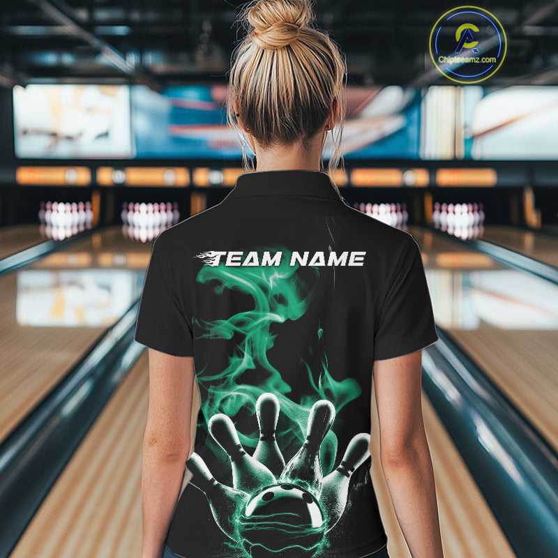 Custom Green Smoke Bowling Polo Team Shirts For Women, Flame Bowling League Shirt IPHW9566