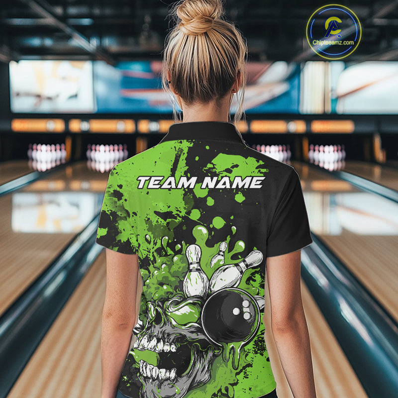 Custom Black And Green Splatter Skull Bowling Team Women Polo Shirt, Halloween Outfit IPHW9728