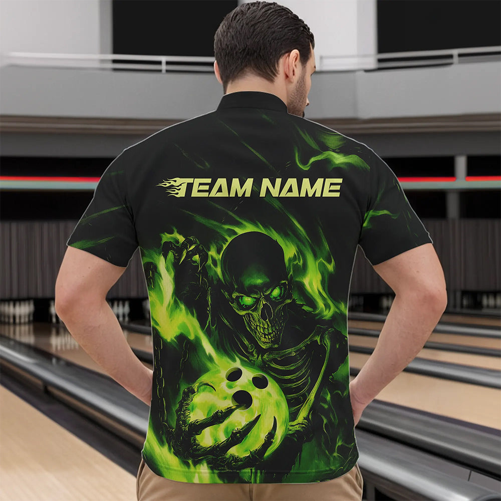 Black And Green Flame Skull Custom Bowling Quarter-Zip Shirts For Men, Skeleton Bowling Team Shirt IPHW8400