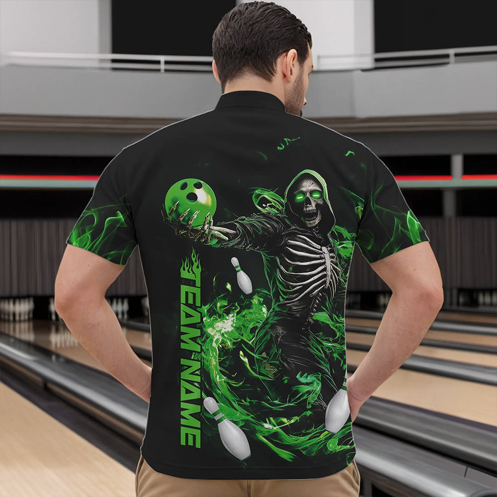 Custom Black And Green Skeleton Bowling Quarter-Zip Shirts For Men, Skull Bowling Tournament Shirt IPHW8410