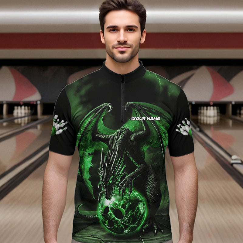 Black And Green Custom Bowling Team Quarter-Zip Shirts For Men, Dragon Bowling League Shirts IPHW8691